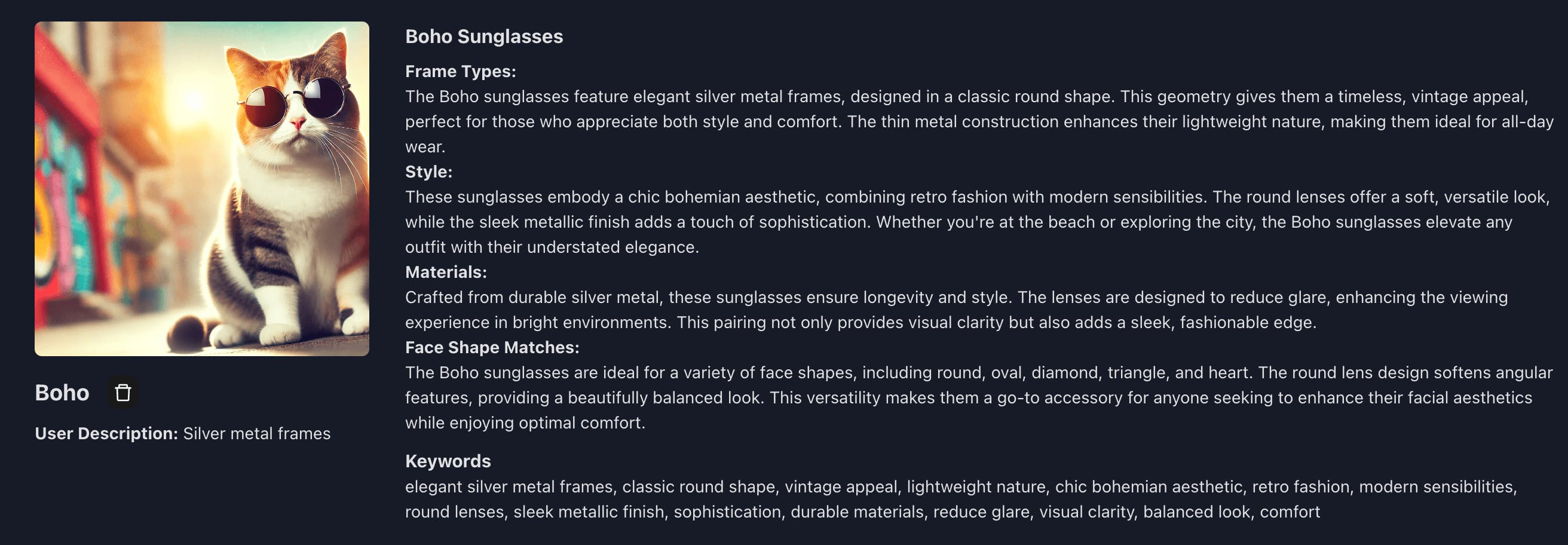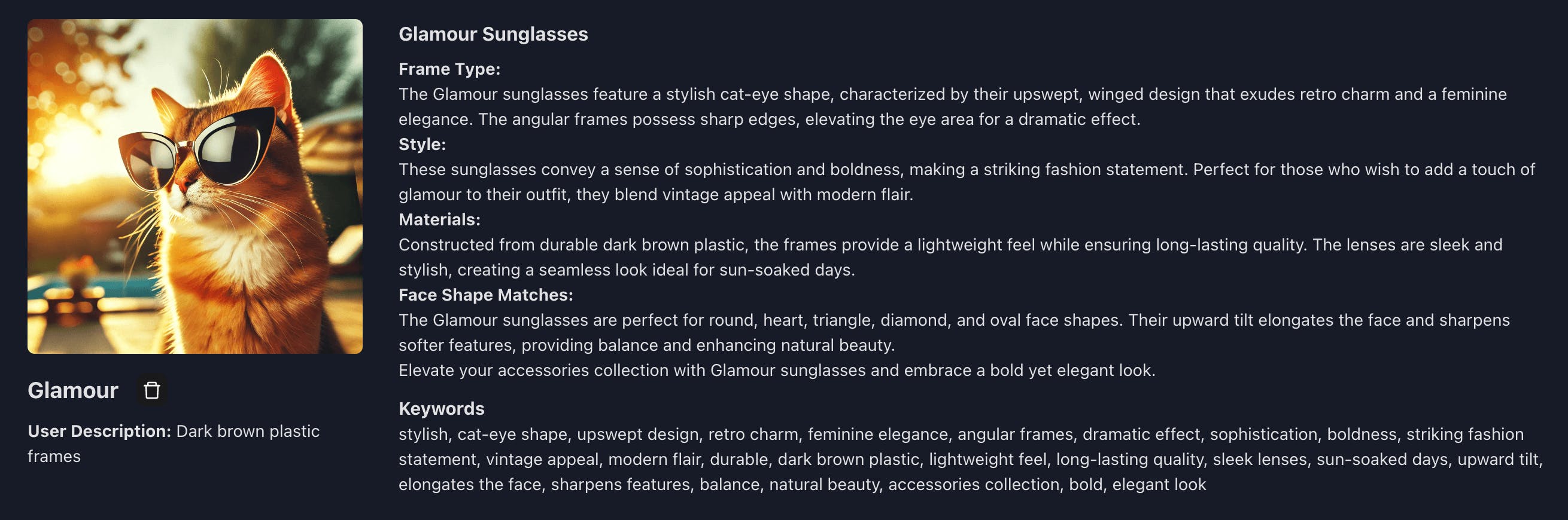 I found GPT-4’s vision on its own to be mostly accurate, but it struggled with material differentiation (e.g., plastic vs. wire frames). To address this, I added a field where users could input extra details, which the model easily integrates. The other challenge I encountered was that the descriptions could be a bit too general or inventive, and I wanted to follow some established categorization of lens types. To fine-tune this, I incorporated a sunglasses guide into the prompt, outlining various frame shapes and the face types they best complement.